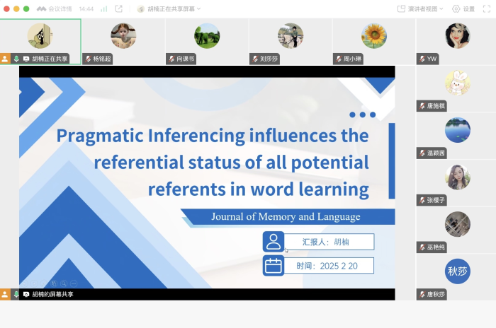 2025年2月20日下午,bevictor伟德官网语言认知科学研究团队在线上举行了本年度第一次科研例会。本次科研例会主要围绕“语用层面的词汇学习”及“R语言基础知识学习及数据可视化”两部分展开,分别由胡楠博士和23级翻译专业硕士生杨铭超同学进行汇报。本次例会由团队负责人向课书博士主持,语言认知科学研究团队主要成员及部分硕士生参加了本次例会。